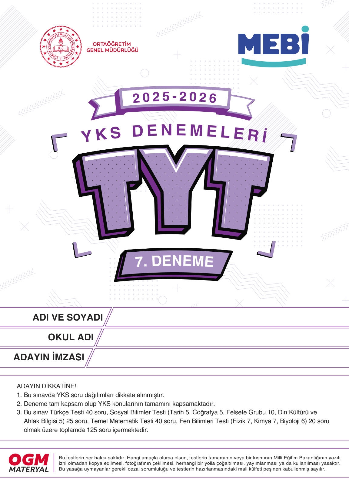 MEBİ YKS Denemeleri TYT 7. Deneme Panda Fotokopi & Baskı Merkezi
